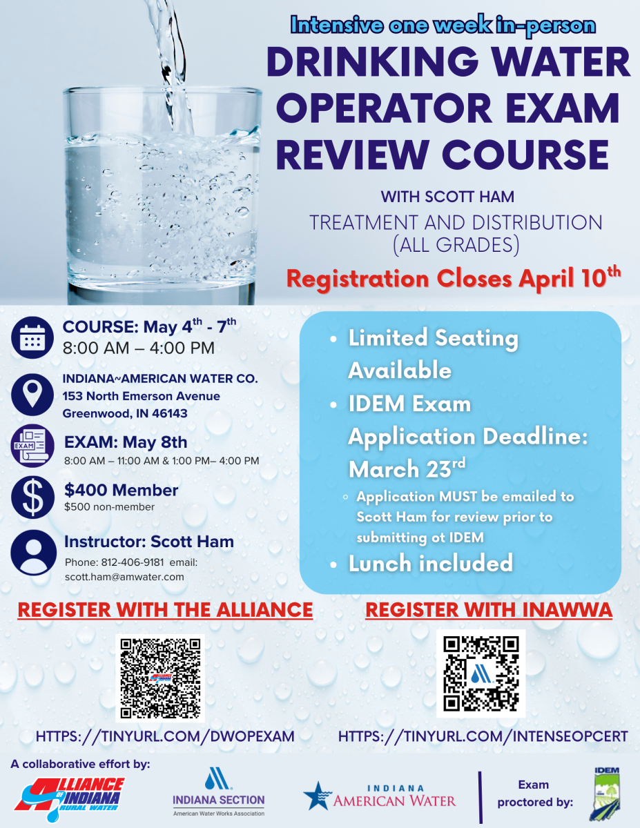 Indiana Section AWWA (INAWWA)- Alliance of Indiana Rural Water (AIRW)- Indiana American Water Company (INAW)-Indiana Department of Environmental Management (IDEM)*- *IDEM will serve as the exam proctor only on Friday.
